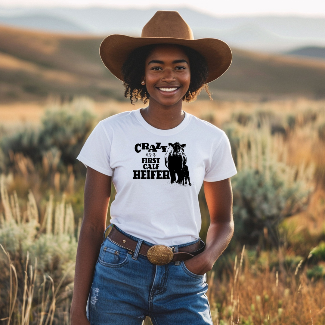 For those wild moments when things don’t go as planned, there’s the "Crazy as a First Time Heifer" t-shirt. With its playful nod to the unpredictable nature of a first-time heifer, this tee is perfect for anyone who’s been around the chaos of ranch life—or who just knows how to embrace a little crazy.