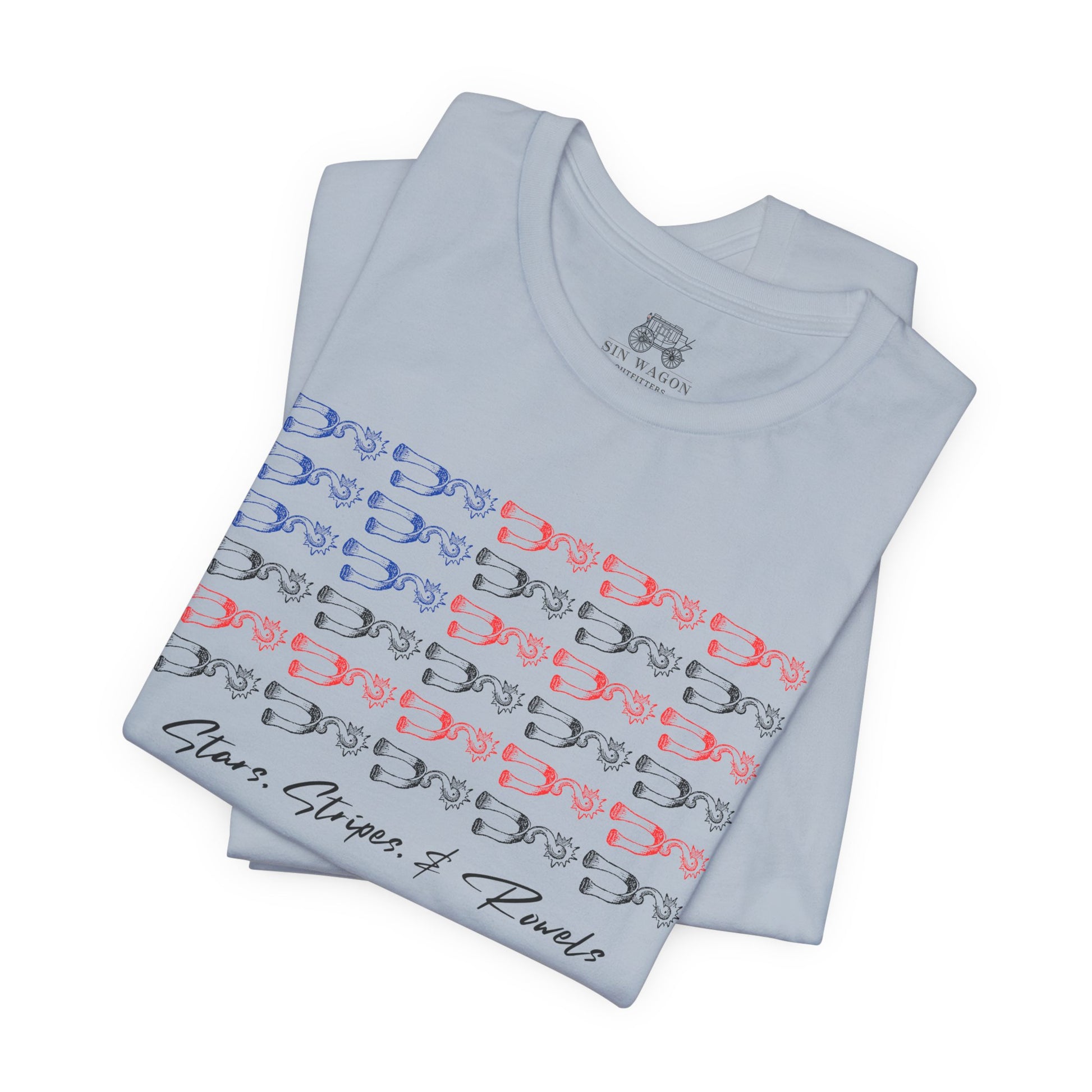 Proudly wave your flag and jingle your spurs. This Sin Wagon Outfitters original is for the ones who live free, ride hard, and never forget where they come from. With a bold nod to cowboy grit and American pride, this tee is built for rodeos, front porch beers, and every dust-kicked trail in between.